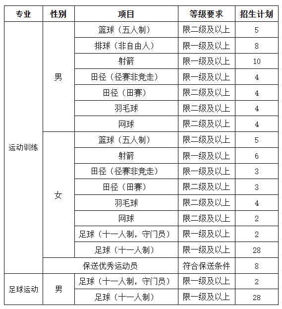2.运动训练专业招生计划100人(含优秀运动员保送入学),足球运动专业招生计划30人,最终录取人数视生源情况及上级主管部门批复决定。